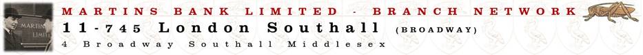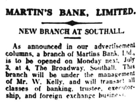 Martins Bank’s Southall Branch opens in 1933, on a street corner at Broadway. This splendid image from August 1937 shows the Branch almost dwarfed by the sign for the auction and estate offices next door!