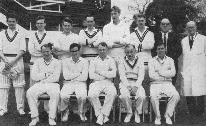 Taylor (Umpire) Seated: J F Cowburn M Skidmore D M Pollard
